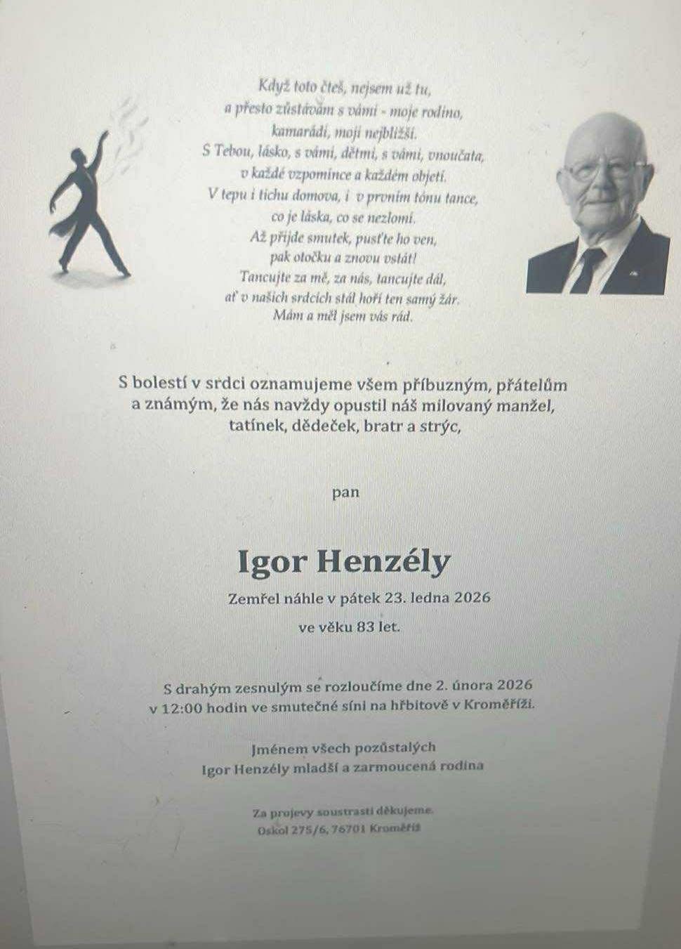S hlubokým zármutkem oznamujeme, že dne 23. 1. 2026 nás ve věku 83 let navždy opustil Igor Henzély st., výrazná osobnost českého tanečního sportu, dlouholetý tanečník, trenér a porotce. Poslední rozloučení se uskuteční 2. 2. 2026 ve 12:00 ve smuteční síni na hřbitově v Kroměříži. Za ČSTS vyjadřujeme rodině, přátelům a všem blízkým upřímnou soustrast.
