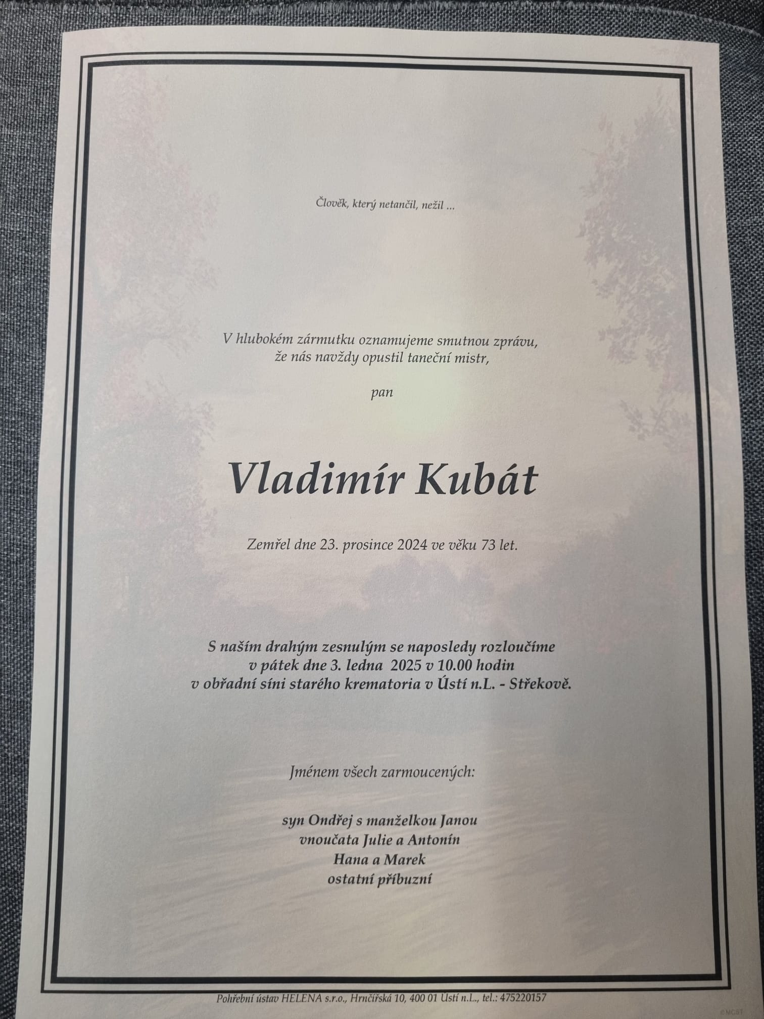 Dne 3.11.2009 nás náhle opustil úspěšný tanečník, kamarád, trenér, bývalý porotce a přítel tanečního sportu Antonín Rejhon ve věku 64 let. Poslední rozloučení se koná 12.11. ve 14.00 hodin v kostele ve Velkých Popovicích.