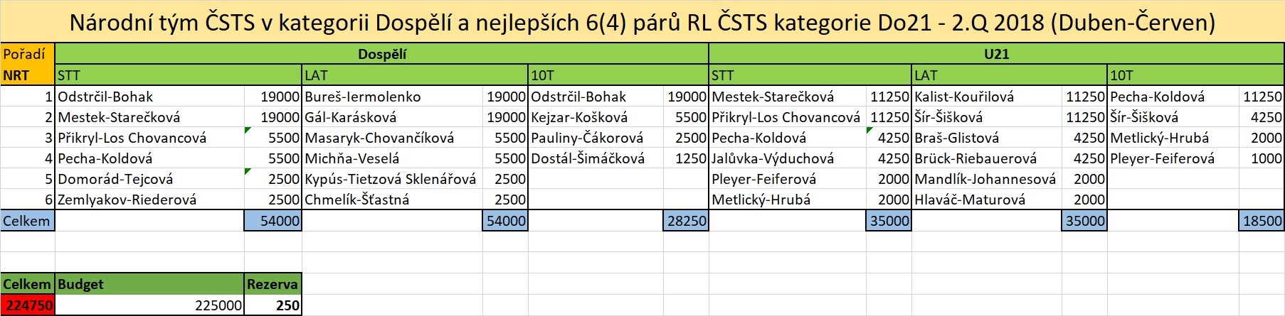 Finanční podpora NRT dospělých a nejlepších párů RL Do 21 ve 2. čtvrtletí 2018