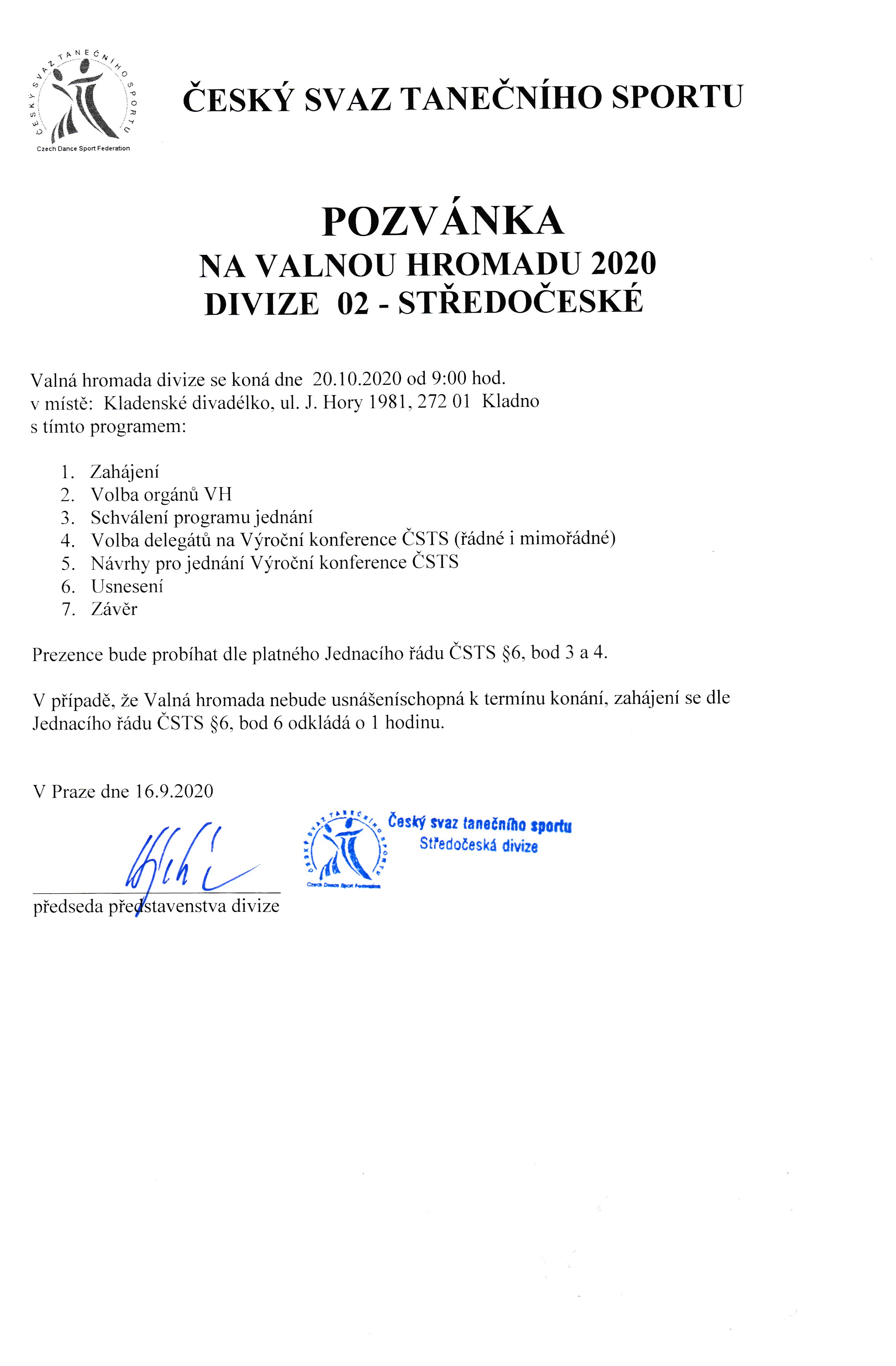 S ohledem na platná opatření proti šíření koronaviru se mění termín Valné hromady Středočeské divize na 24.11.2020