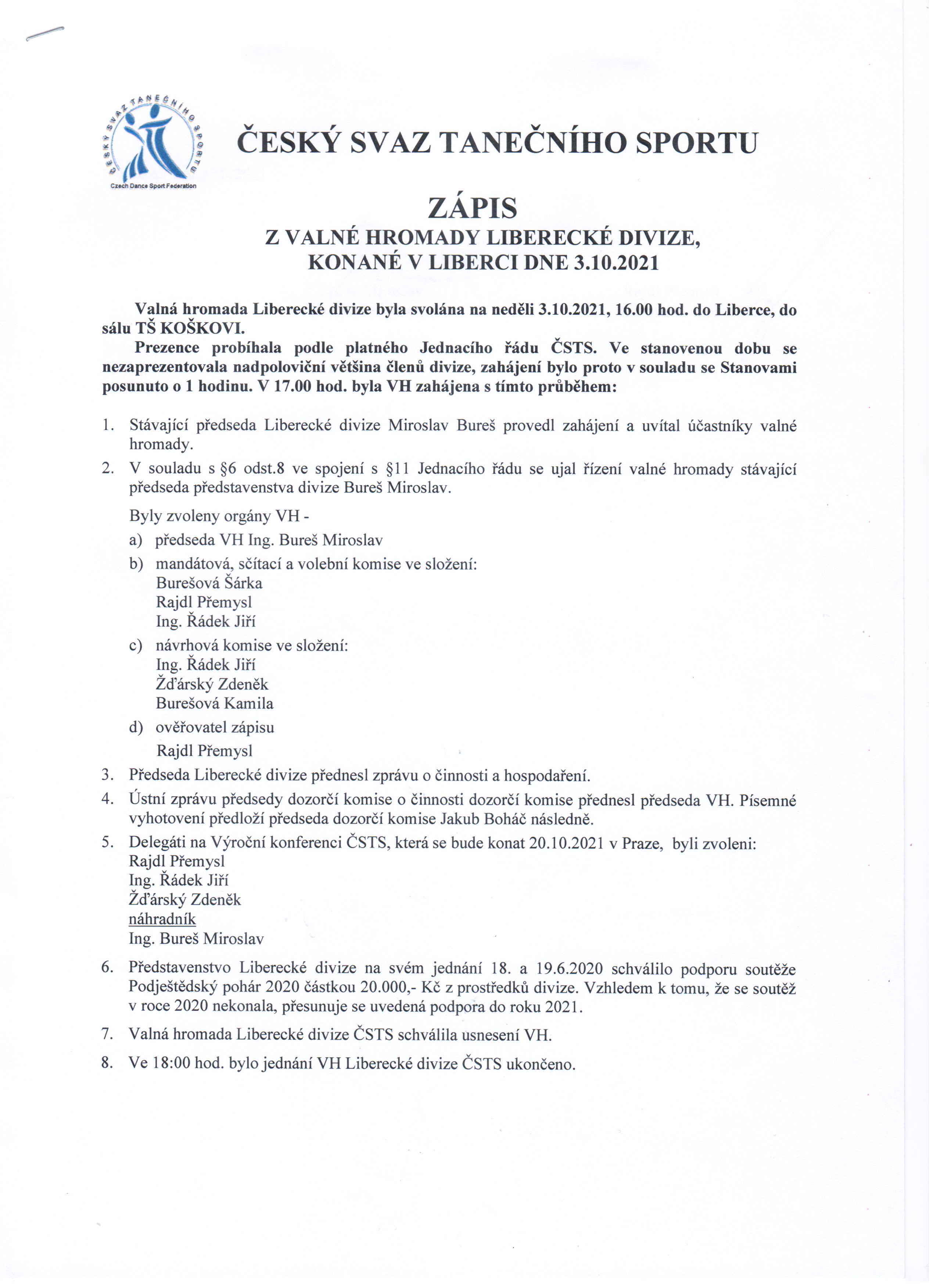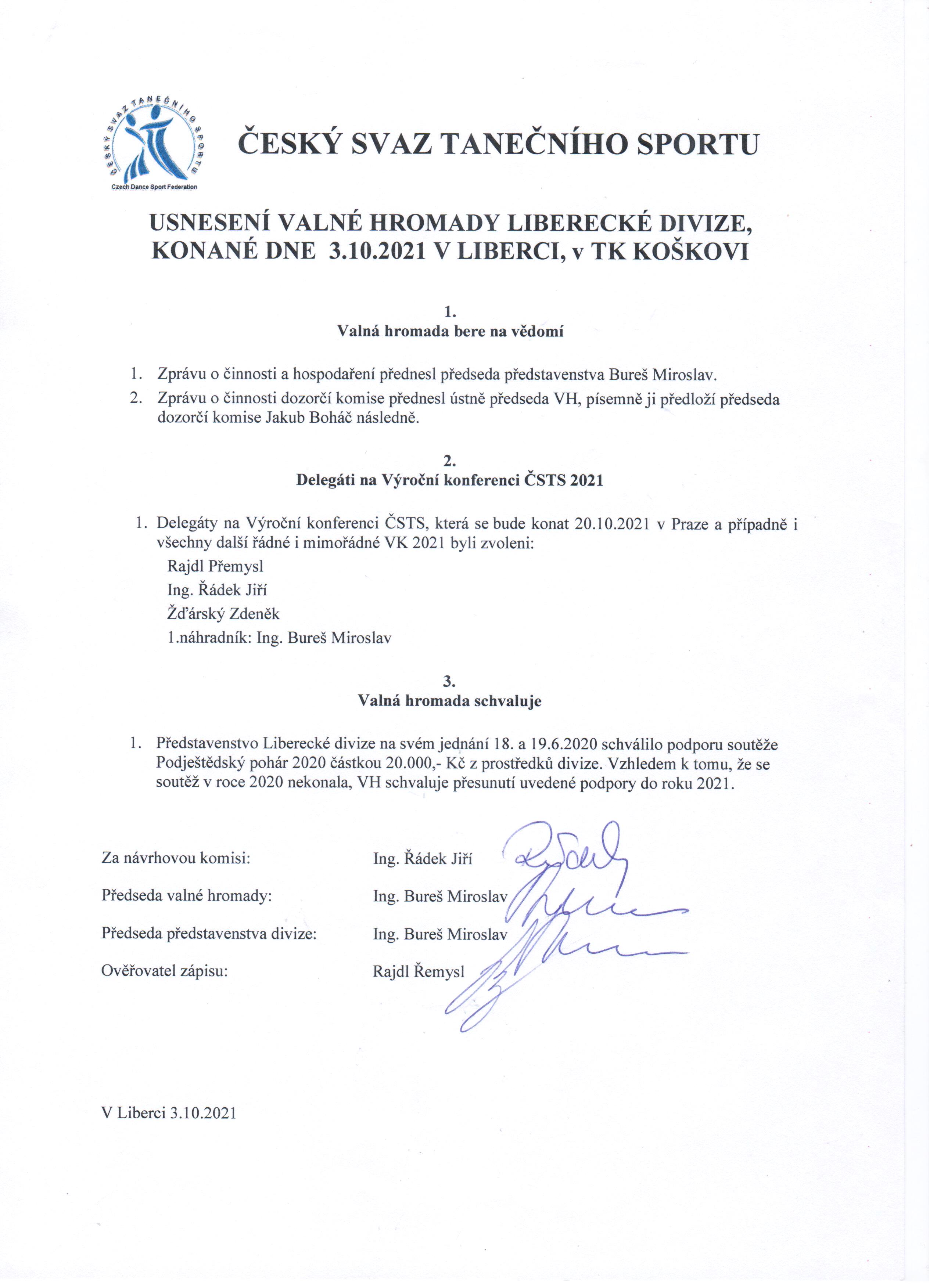 Usnesení valné hromady Liberecké divize konané 3.10.2021 v Liberci, v TK Koškovi - delegáti na VK ČSTS 2021