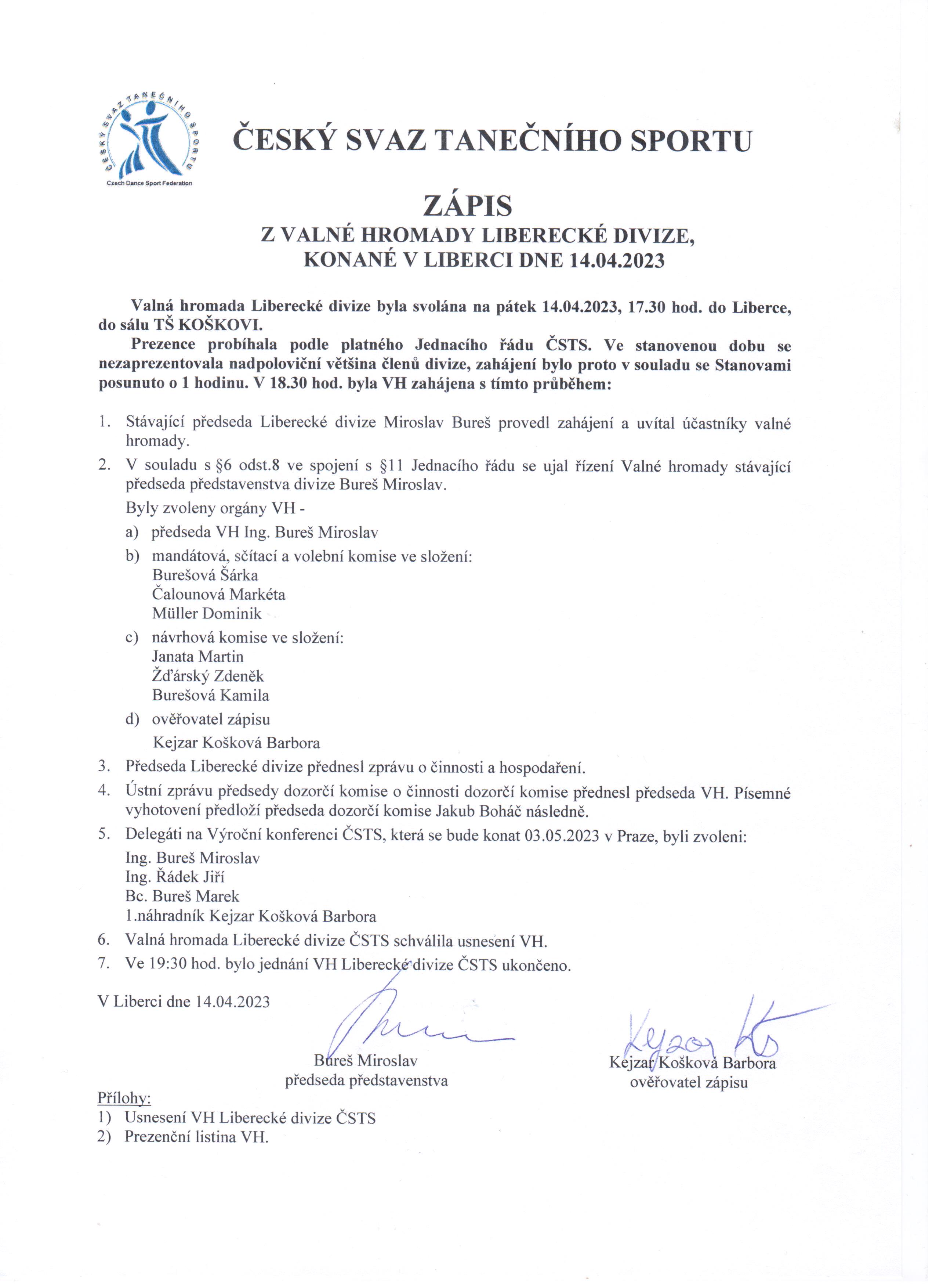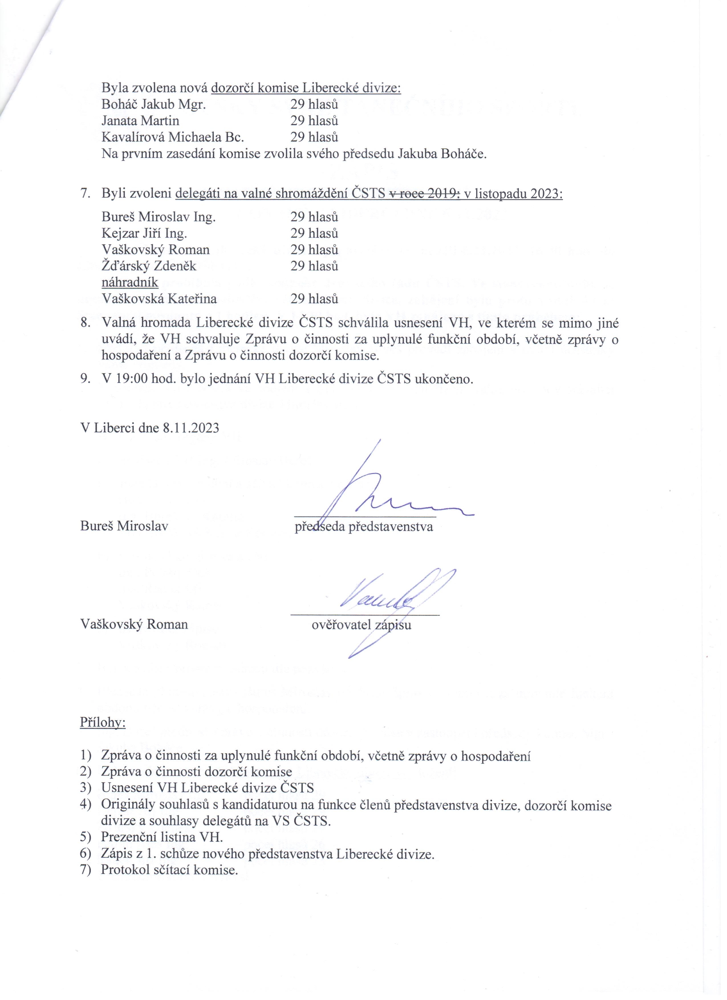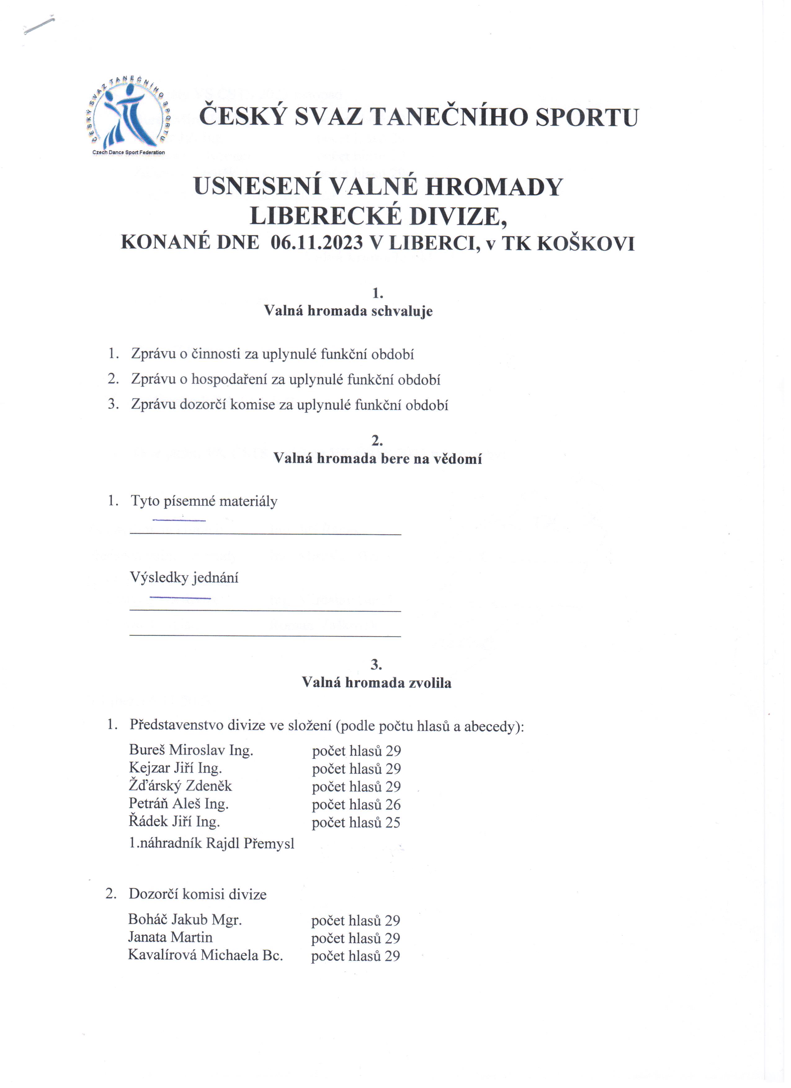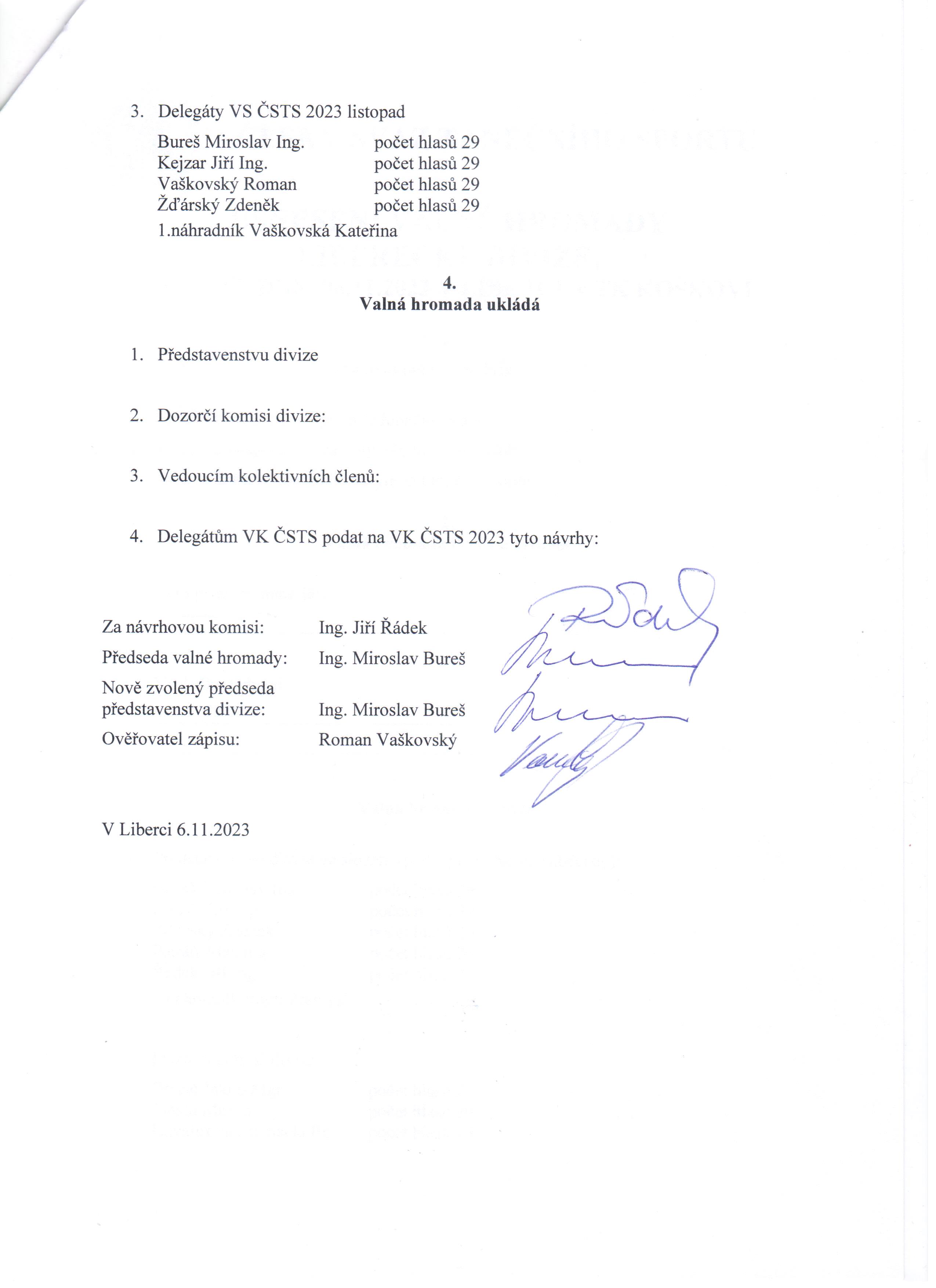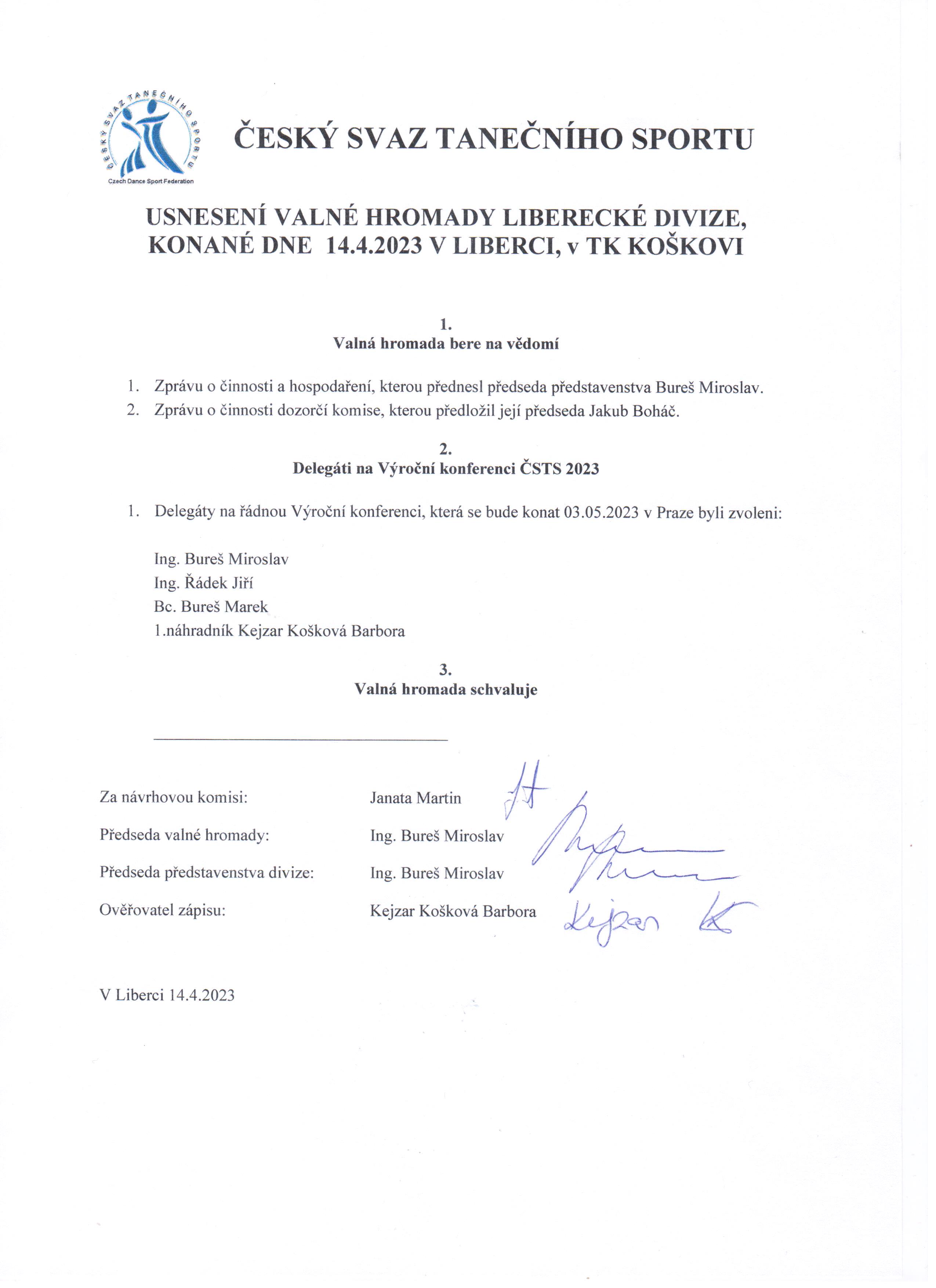 Usnesení valné hromady Liberecké divize konané 14.04.2023 v Liberci, v TK Koškovi - delegáti na VK ČSTS 2023