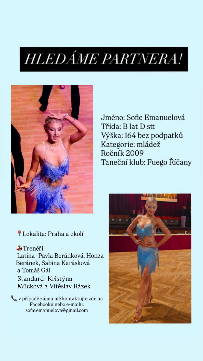 | Hledáme ambiciózního tanečního partnera pro Sofi, primárně na latinu, s chutí trénovat a posouvat se. Tréninky 3–5× týdně, soukromé lekce, soutěže a soustředění jsou samozřejmostí. Praha a okolí. | ||