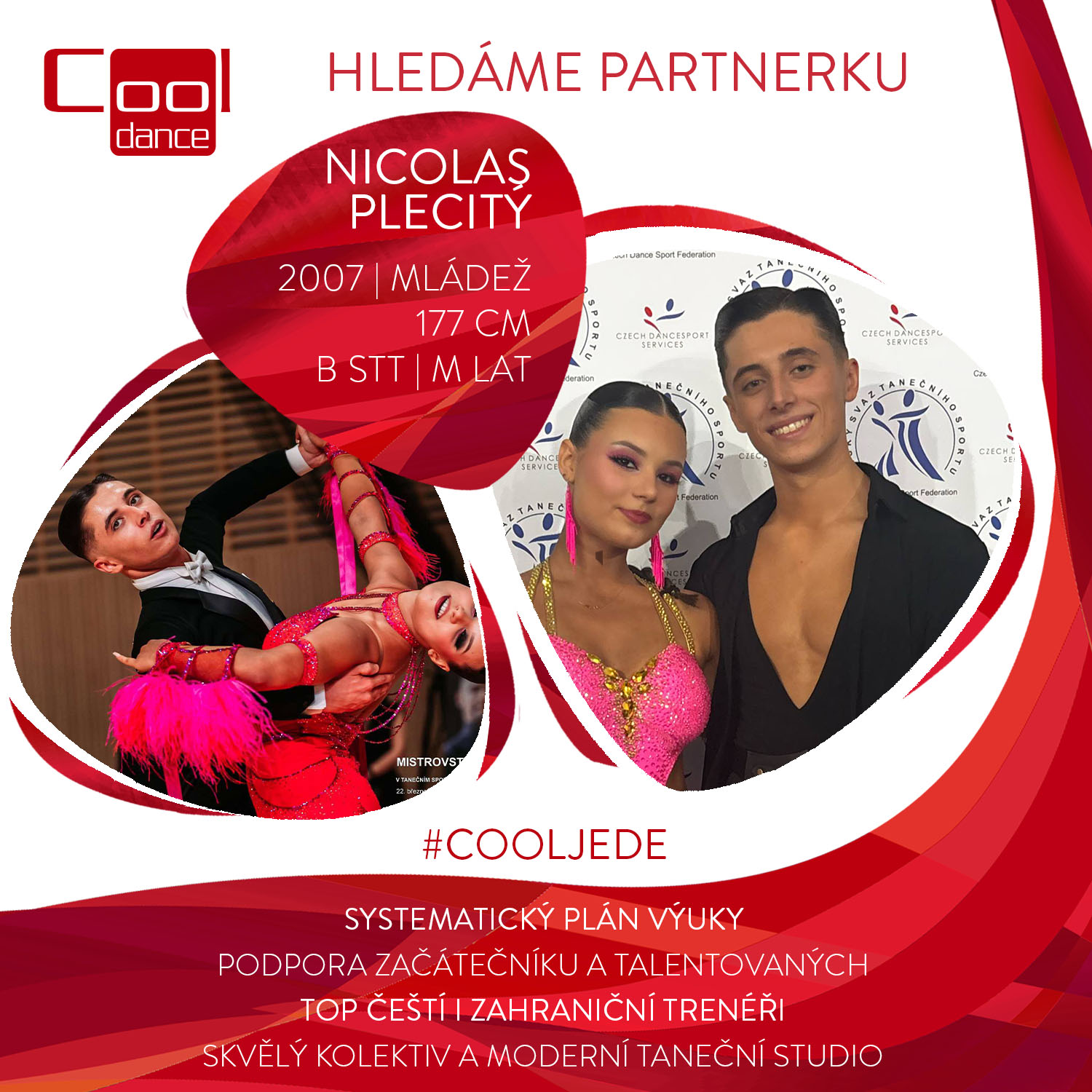 Hledám šikovnou taneční partnerku, která se chce tanci věnovat naplno tak, abychom společně vybudovali silný a ambiciózní pár, který má potenciál posouvat se rychle vzhůru napříč soutěžními třídami ve standardních i latinsko-amerických tancích. Nabízím seriózní a cílevědomý přístup, intenzivní tréninkový plán pod vedením špičkových trenérů v Praze, možnost soustředění (Praha, okolí i mimo Prahu) během roku i prázdnin a stoprocentní nasazení. Očekávám podobné zapálení a spolehlivost. | ||