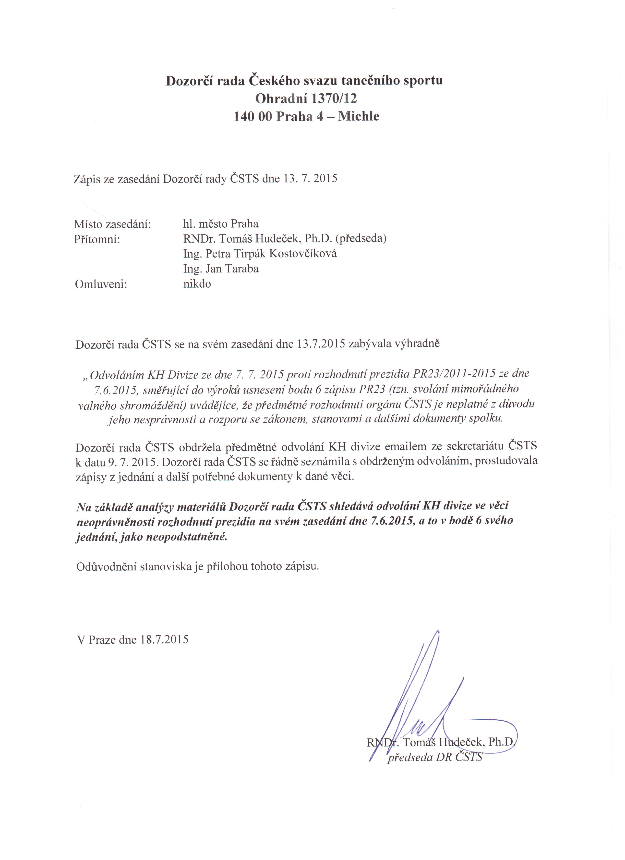 Zasedání DR ČSTS z 13.7.2015 - Odvolání KH divize ze 7.7.2015 - zápis