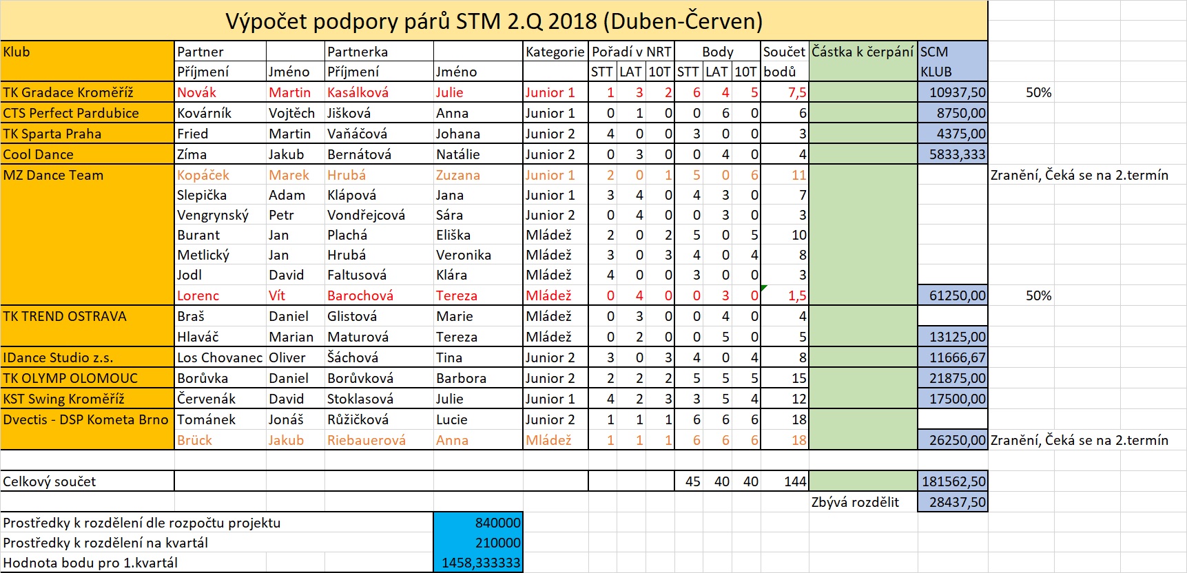 Oranžovou barvou jsou označené páry, které ještě nesplnily testy z důvodů omluvy ze zdravotních důvodů a čeká se na jejich splnění.