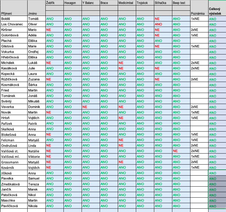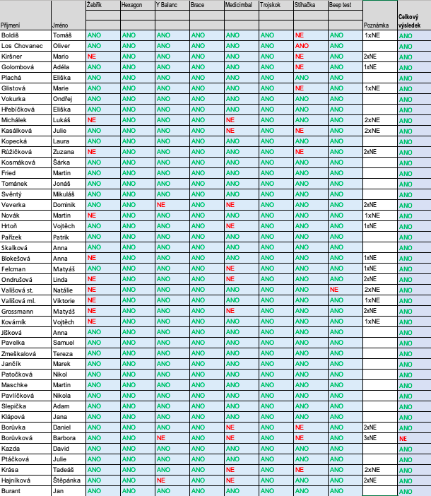 Tabulka je pouze předběžná. Finalní rozdělení bude až po opravném termínu fyzických testů, které proběhnou na 2.srazu v Ostravě.